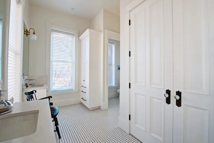 Classic hexagon tile, traditional cabinetry, and antique-inspired lighting create the perfect balance of modern convenience and historic detail.