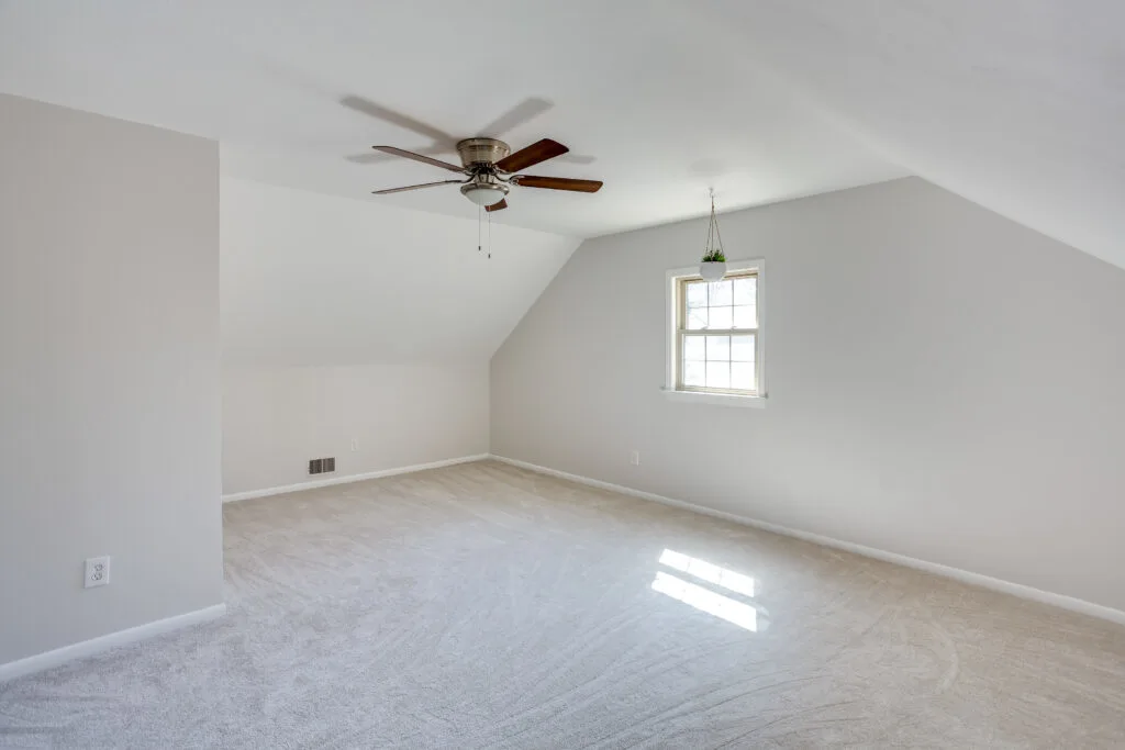We updated the walls, carpet, and ceiling fan. I also had appropriate HVAC ducting installed in the ceiling for maximum comfort.